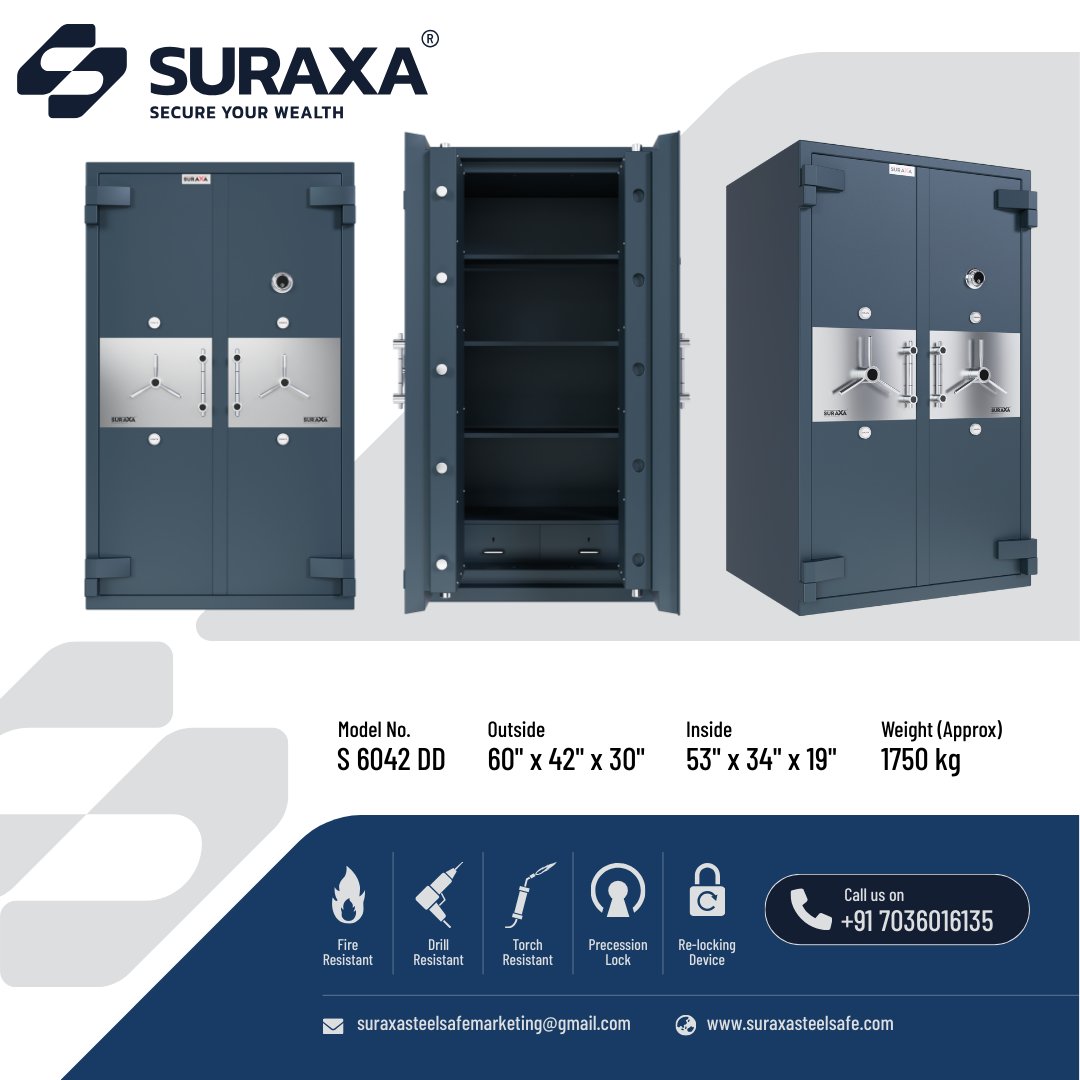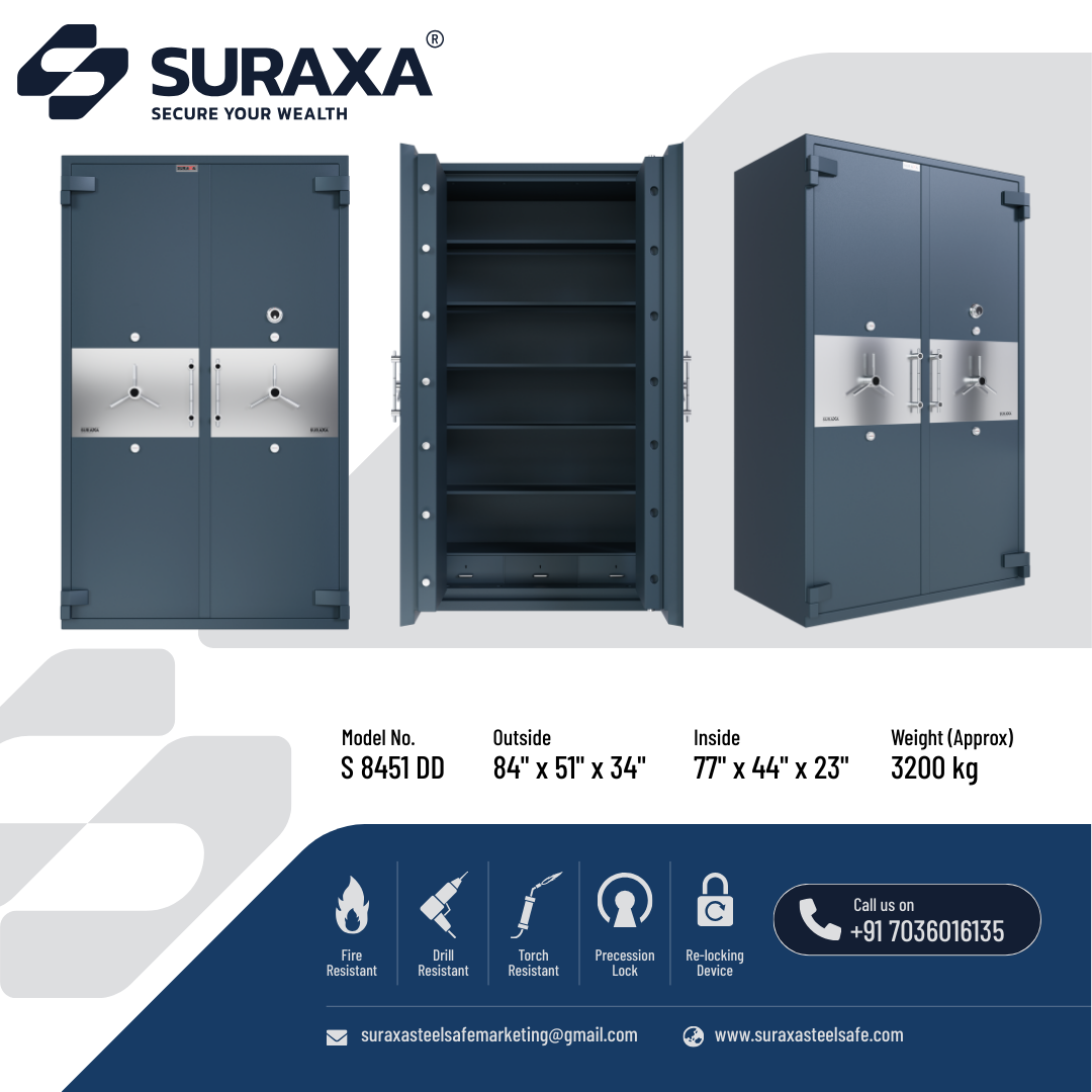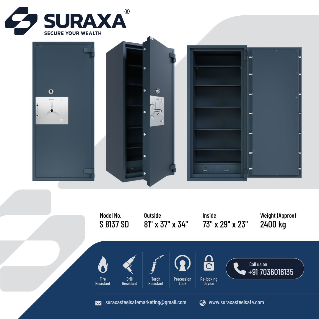 A fully Mig welded, multi-corner single/two joint construction makes the body from total 7mm of tested quality M.S. plate. All 5 sides and the door of the safe are armored with a specially formulated barrier material which is encased between strong outer and inner steel body to withstand the attacks of sledgehammers, power drill and chisel, impact of a fall from upper floors. The overall body thickness on all 5 sides is 100 mm (approx.) including barrier materials which offers fire as well as burglar resistance as per IS: 550 (2005).