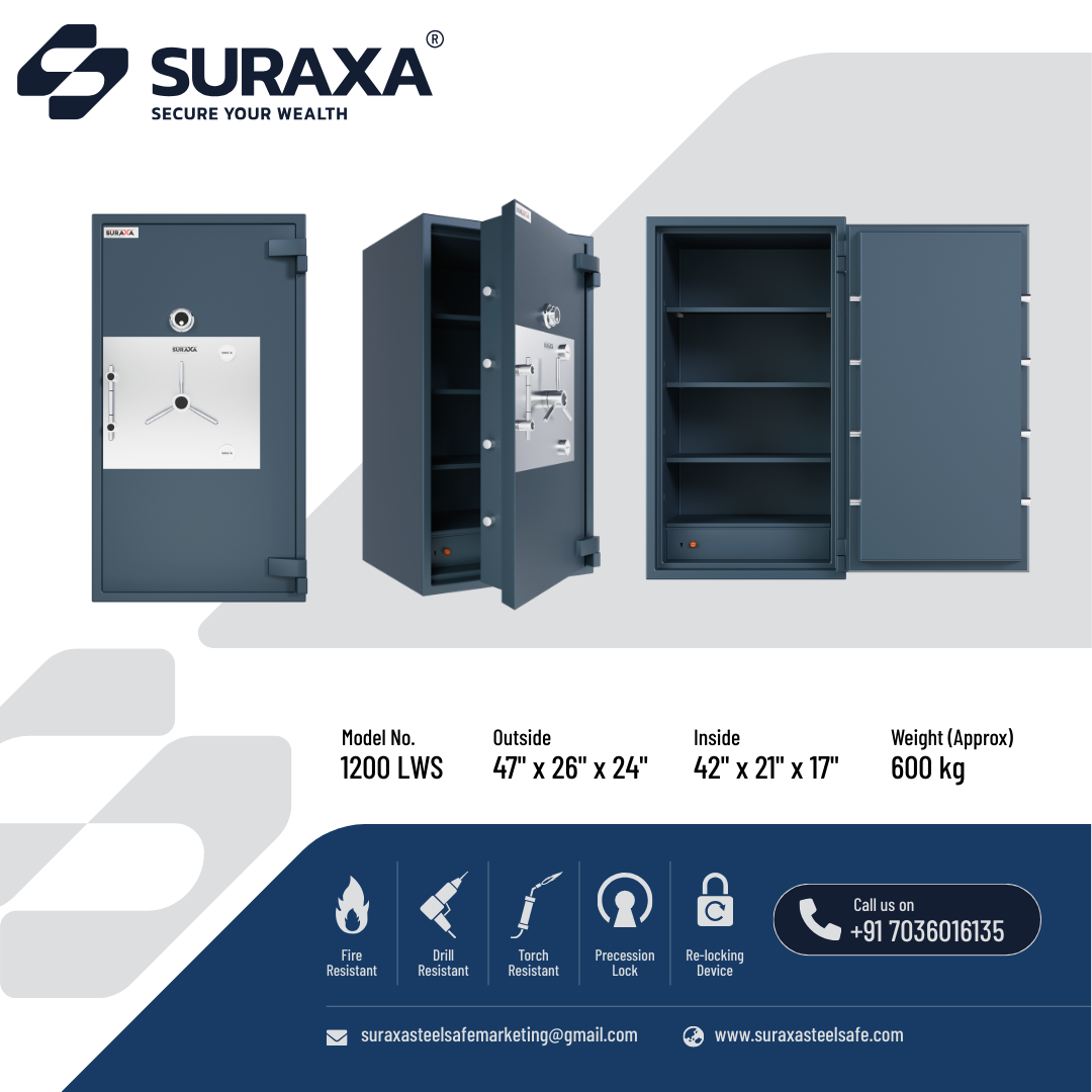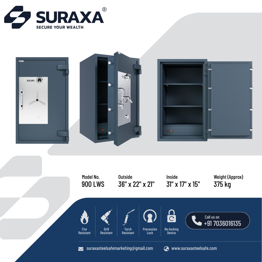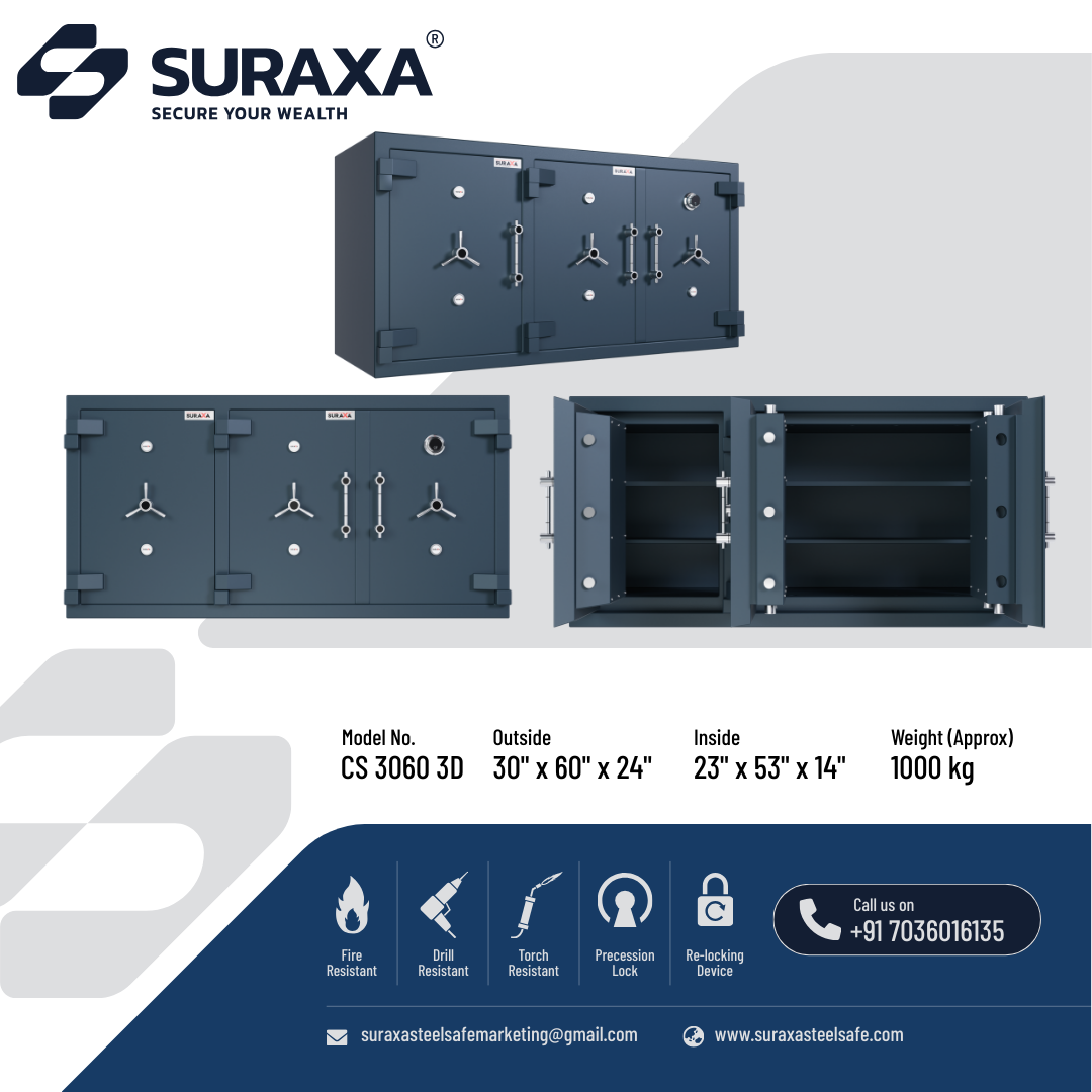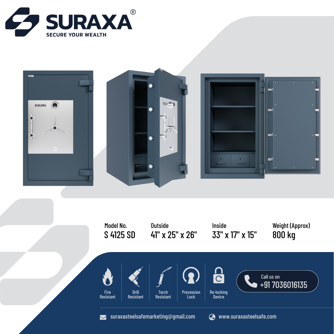 A fully Mig welded, multi-corner single/two joint construction makes the body from total 7mm of tested quality M.S. plate. All 5 sides and the door of the safe are armored with a specially formulated barrier material which is encased between strong outer and inner steel body to withstand the attacks of sledgehammers, power drill and chisel, impact of a fall from upper floors. The overall body thickness on all 5 sides is 100 mm (approx.) including barrier materials which offers fire as well as burglar resistance as per IS: 550 (2005).